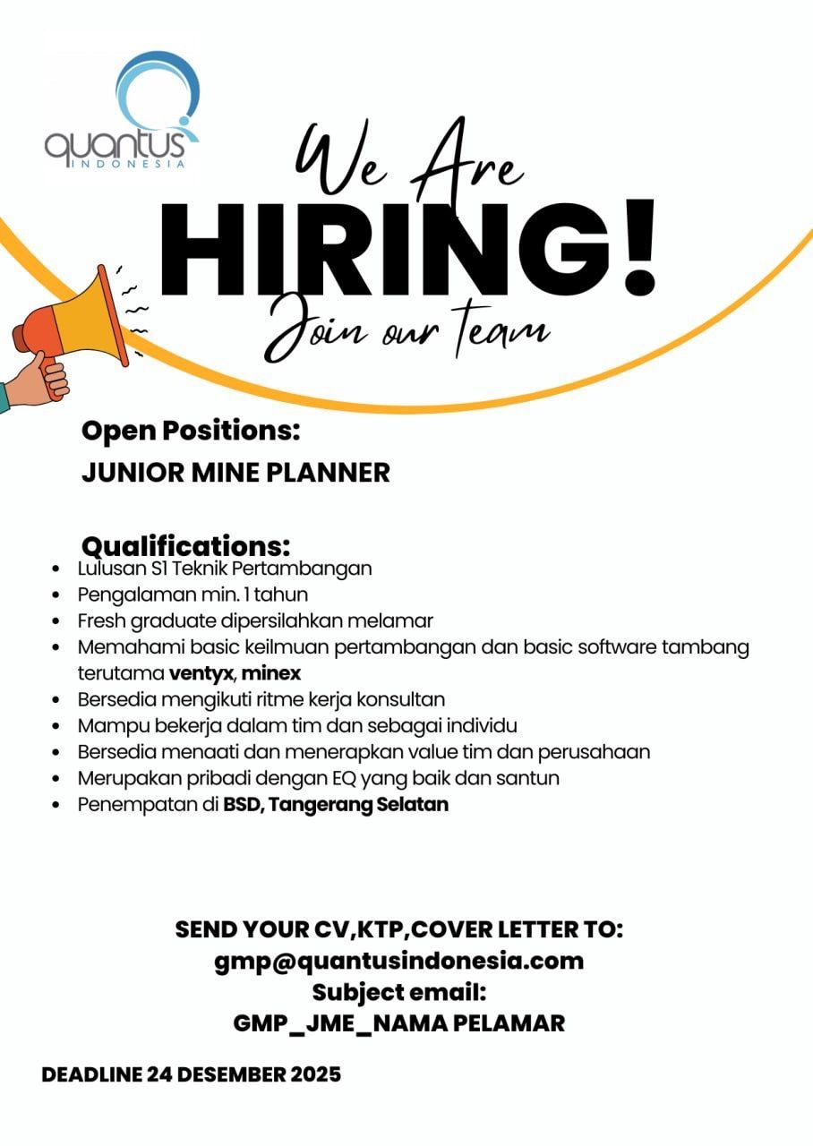 Quantus Indonesia saat ini membuka kesempatan karier bagi individu yang memiliki ketertarikan dalam bidang perencanaan tambang, terutama bagi lulusan baru maupun kandidat berpengalaman.