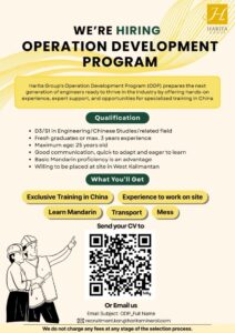 Harita Group adalah perusahaan nasional yang bergerak di bidang pertambangan dan pengolahan mineral. Saat ini Harita Group membuka kesempatan bagi lulusan terbaik untuk mengikuti Operation Development Program (ODP) sebagai penyiapan tenaga kerja profesional di bidang operasi tambang.