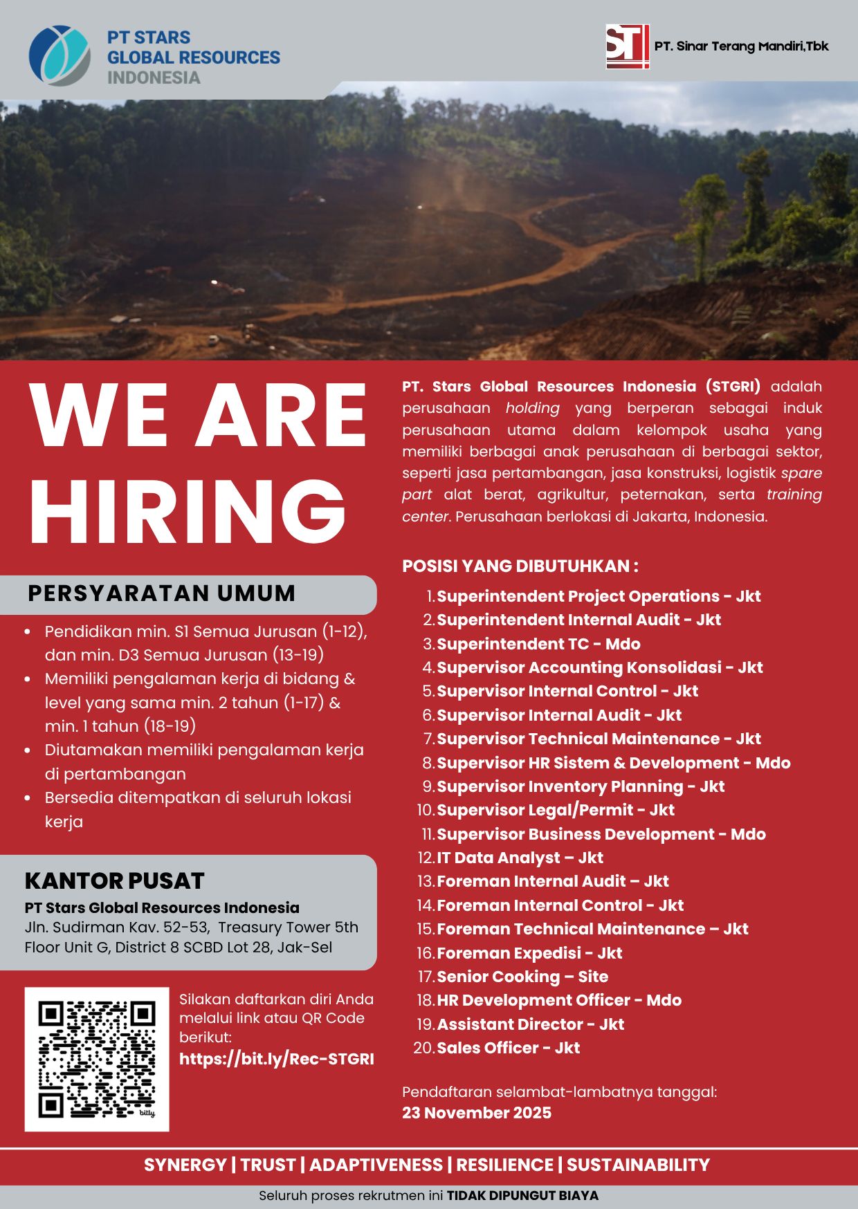 Berkantor pusat di Jakarta, STGRI terus berkembang sebagai bagian dari PT Sinar Terang Mandiri, Tbk, dengan komitmen terhadap profesionalisme, inovasi, dan keberlanjutan di industri sumber daya alam Indonesia.